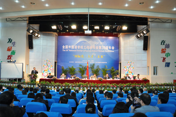 10月20日至21日,全國外國語學(xué)校工作研究會(huì)第30屆年會(huì)在四川現(xiàn)代教育集團(tuán)德陽外國語學(xué)校舉行。本屆年會(huì)由全國外國語學(xué)校工作研究會(huì)主辦,德陽外國語學(xué)校承辦。本屆年會(huì)的主題是“國際化、人才、未來”。出席本屆年會(huì)開幕式的有教育部基教二司技術(shù)裝備處處長喬玉全,上海外國語大學(xué)黨委書記、全國外國語學(xué)校工作研究會(huì)會(huì)長、理事會(huì)理事長吳友富,全國外國語學(xué)校工作研究會(huì)秘書長邢三多,德陽市人民政府副市長楊震,四川省教育廳基礎(chǔ)教育處副處長張正華、上海外國語大學(xué)附屬外國語學(xué)校副校長、全國外國語學(xué)校工作部部長趙均寧,德陽市教育工委專職副書記唐發(fā)初,以及來自全國百余所外國語學(xué)校的校長、專家共計(jì)200余人出席了本屆年會(huì)。