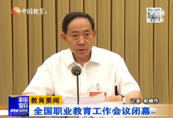 6月24日,全國(guó)職業(yè)教育工作會(huì)議在京閉幕。受?chē)?guó)務(wù)院委托,教育部黨組書(shū)記、部長(zhǎng)袁貴仁代表職業(yè)教育工作部際聯(lián)席會(huì)議六部門(mén)作會(huì)議總結(jié)。(圖片來(lái)源:中國(guó)教育電視臺(tái))