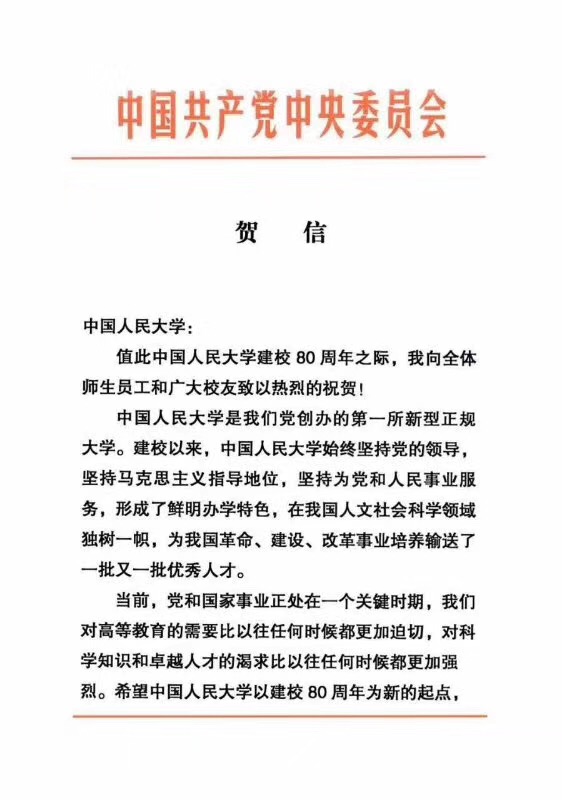 習(xí)近平總書記向中國人民大學(xué)建校80周年發(fā)來賀信